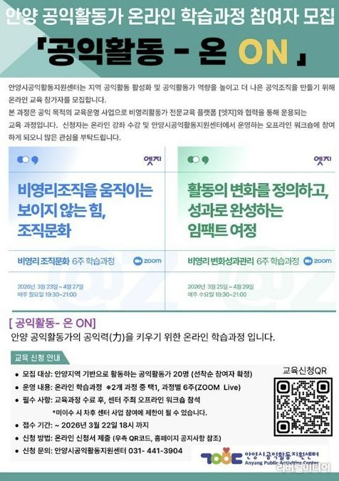 [리버럴미디어=공소리 기자] 안양시공익활동지원센터가 지역 공익활동가들의 철학적 토대를 다지는 교육을 성공적으로 마친 데 이어, 실천적 전문성을 높이기 위한 온라인 교육 과정을 본격 가동하며 활동가 지원에 박차를 가하고 있다.