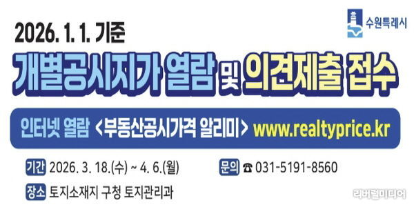 [리버럴미디어=공소리 기자] 수원시 영통구는 3월 18일부터 4월 8일까지 20일간 2026년 1월 1일 기준 개별공시지가에 대한 열람을 실시하고 토지소유자 및 이해관계인의 의견을 접수한다.