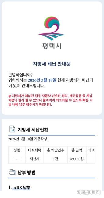 [리버럴미디어=공소리 기자] 평택시는 ‘모바일 전자고지 시스템’을 활용해 지방세 체납자 1만7천여 명을 대상으로 오는 23일과 24일 이틀 동안 전자문서 형태의 체납안내문을 발송할 예정이다.