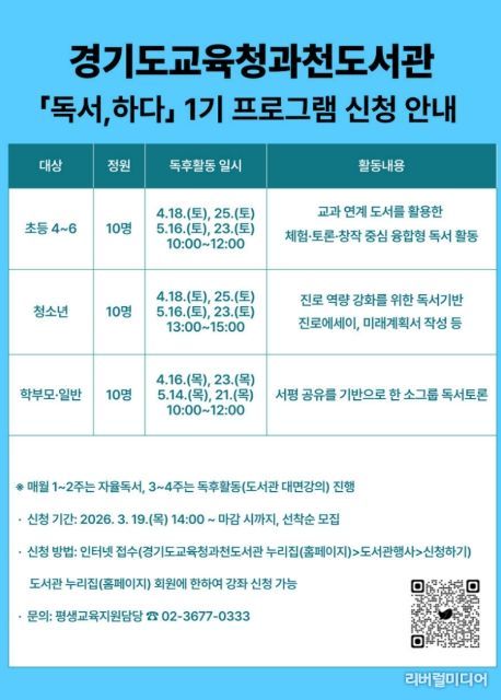 [리버럴미디어=공소리 기자] 경기도교육청과천도서관이 지역주민의 독서 역량 강화와 융합적 사고력 함양을 위해 '2026년 독서, 하다’프로그램을 운영한다.