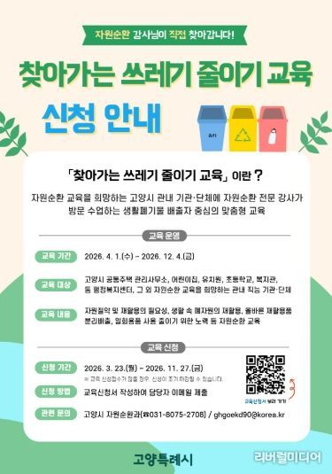 [리버럴미디어=공소리 기자] 고양특례시는 생활 속 자원순환 실천을 유도하기 위해 오는 4월부터 12월까지 9개월간 ‘2026년 찾아가는 쓰레기 줄이기 교육’을 운영한다.