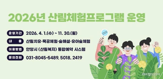 [리버럴미디어=공소리 기자] 안양시는 4월부터 서울대 안양수목원을 비롯한 관내 수목원에서 ‘산림체험 프로그램’ 운영을 시작하며, 현재 통합예약시스템을 통해 사전 예약을 접수 중이라고 23일 밝혔다.