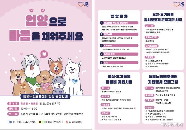 지난해 시흥시에 접수된 551마리의 유실‧유기 동물 중 절반 이상인 308마리가 입양‧기증됐다. 시는 건강한 입양 문화 활성화를 위해 유실‧유기 동물을 입양하는 반려가족에게 반려동물 진료비, 검진비 등 입양 후 필요한 최소한의 비용(15만 원 한도)을 지원함으로써 입양률을 높이고자 노력하고 있다. 국내 입양이 어려운 중‧대형견도 동물보호단체와 연계해 해외 입양을 지원한다.
