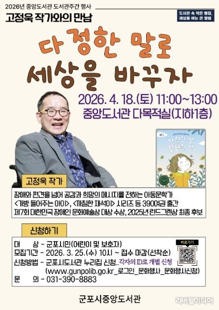 행사 관련 사항은 군포시도서관 누리집 공지사항에서 확인할 수 있으며, 참여 신청은 3월 25일부터 선착순으로 접수한다.