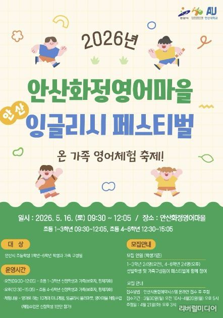 [리버럴미디어=공소리 기자] 안산시가 설립하고 안산대학교가 운영하는 안산화정영어마을은 ‘온 가족 영어체험 축제!’를 주제로 ‘안산 잉글리시 페스티벌’을 운영한다고 24일 밝혔다.
