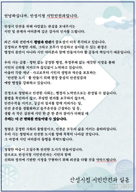 [리버럴미디어=공소리 기자] 안성시는 각종 안전점검 과정에서 청렴 안내문을 배부하는 ‘청렴한 안전점검’을 추진하며 시민 청렴의식 제고에 나선다.