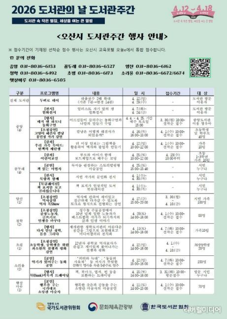 한편, 행사 관련 자세한 내용은 오산시 각 도서관 및 교육포털을 통해 확인할 수 있다.