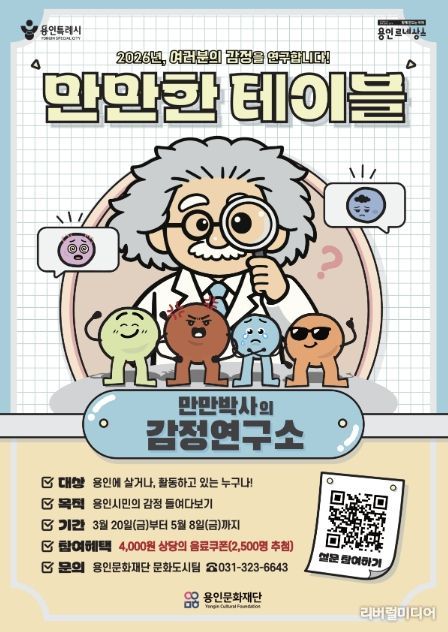 [리버럴미디어=공소리 기자] 용인문화재단은 문화예술을 통한 용인시민의 감정 해소에 대한 의견을 수렴하는 프로젝트 ‘2026 만만한 테이블’을 진행한다.