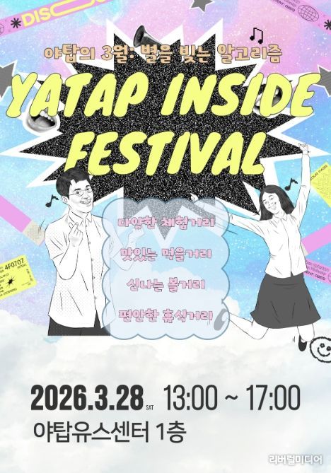 [리버럴미디어=공소리 기자] 성남시청소년청년재단 야탑유스센터는 오는 3월 28일 오후 1시부터 야탑유스센터 1층 로비와 광장에서 청소년과 청년, 지역주민이 함께 즐기는 체험형 축제 ‘2026 [YATAP INSIDE - 안에 다 있다] 야탑의 3월: 별을 빚는 알고리즘’을 개최한다.