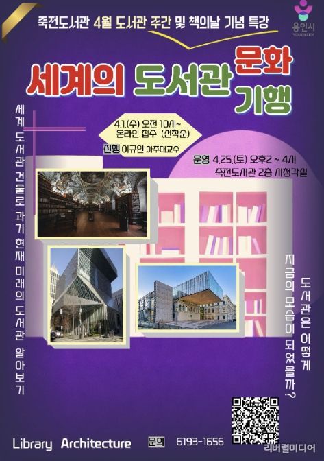 [리버럴미디어=공소리 기자] 용인특례시 죽전도서관은 4월 도서관 주간을 맞아 인문학 기념특강 ‘세계의 도서관 문화기행’을 개최한다.