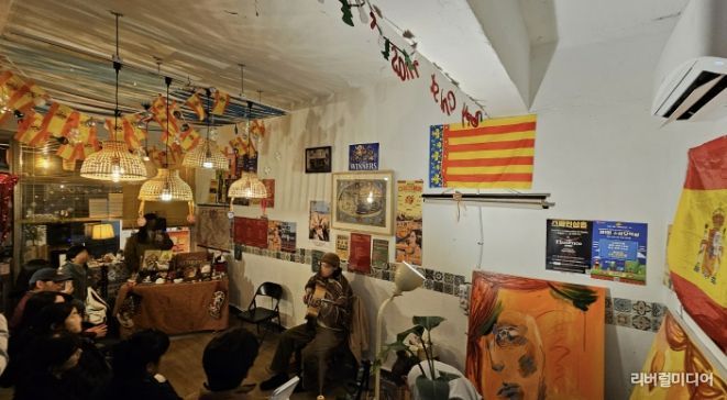 골목에 위치한 작은 가게에는 스페인 국기 가랜드와 FC바르셀로나 팀기, 각종 모임과 공연 포스터, 감각적인 유화작품들이 여기저기 걸려있다. 제멋대로인 듯 일종의 규칙과 문화를 품고 있는 공간을 보고 있노라면 주인장의 정체가 궁금해진다.