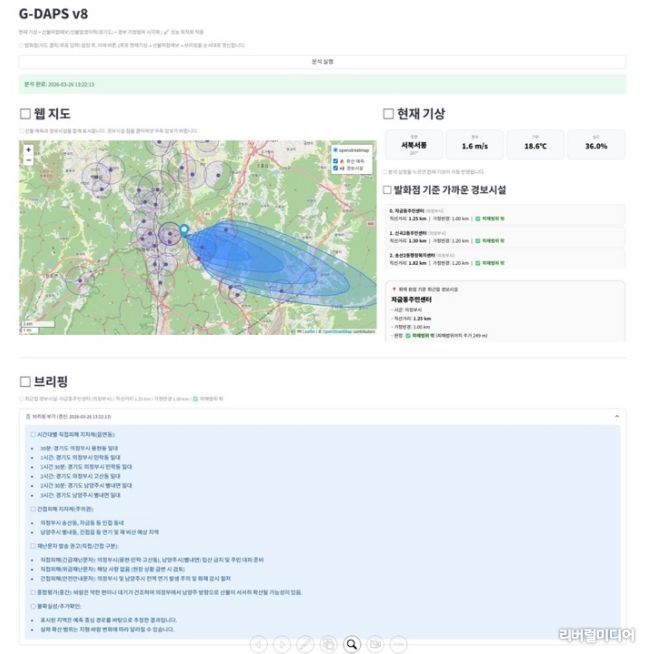 기상 상황과 산불위험예보 및 발생 이력, 민방위 경보시설 가청 범위를 웹 지도에 시각화하여 보여준다. 이를 바탕으로 산불 위험을 30분 단위로 분석해 직접 피해를 입는 읍면동 단위까지 피해 지자체를 파악한다. 근무자는 이 정보를 활용해 특정지역에 대한 경보 발령, 재난문자 발송 등을 할 수 있다.