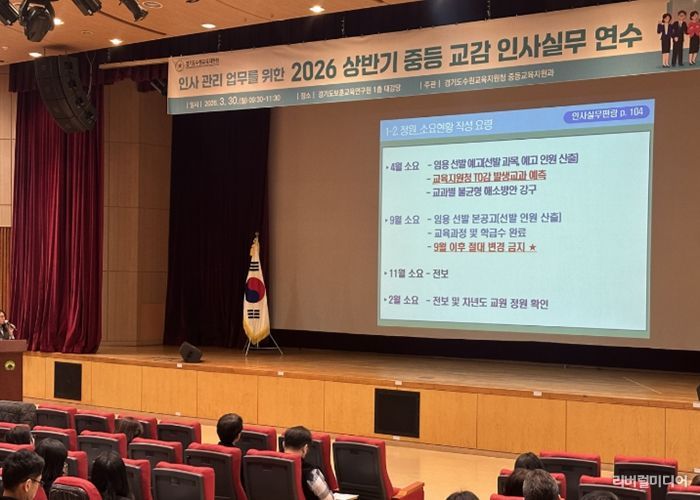 [리버럴미디어=공소리 기자] 경기도수원교육지원청은 3월 30일 경기도보훈교육연구원에서 관내 중·고등학교 인사업무 담당자(교감)를 대상으로 연수를 실시했다. 이를 통해 교원 인사관리 전반에 대한 이해도를 제고하고, 실무 중심의 업무 수행 역량을 강화했다.