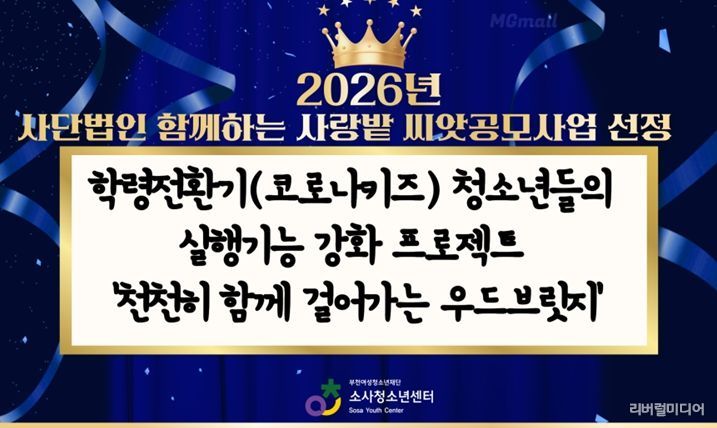 [리버럴미디어=공미소 기자] 부천여성청소년재단이 운영하는 소사청소년센터가 사단법인 함께하는 사랑밭 주관 ‘2026년 함께하는 사랑밭 [씨앗공모사업]’ 기획공모 분야에 ‘학령전환기(코로나키즈) 청소년들의 실행기능 강화 프로젝트-천천히 함께 걸어가는 우드브릿지’ 프로그램이 선정됐다.