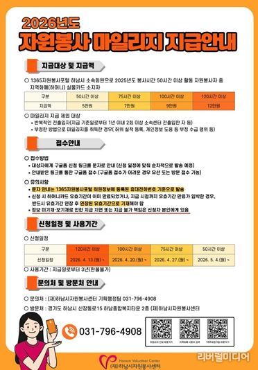 센터는 1365자원봉사포털에 하남시 소속 회원으로 등록된 자원봉사자 가운데 2025년도 봉사 시간이 50시간 이상인 실적 보유자를 대상으로 자원봉사 마일리지를 지급한다고 밝혔다. 지급 수단은 하남시 지역화폐인 ‘하머니’ 실물 카드 충전 방식이며, 봉사 시간 구간에 따라 차등 지급된다.