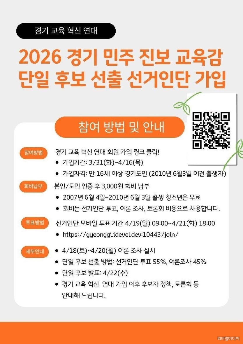 [리버럴미디어=공소리 기자] 2026 경기도교육감 민주진보 단일후보를 내기 위한 선거인단 가입이 지난 3월 31일부터 시작됐다.