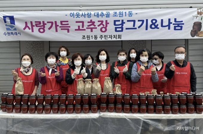 [리버럴미디어=공소리 기자] 수원시 장안구 조원1동 주민자치회는 지난 1일, 복지행정분과 주관으로 ‘사랑가득 고추장 담그기’ 행사를 열고, 직접 담근 고추장을 관내 취약가구 200여 세대에 전달했다.