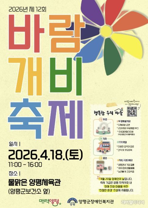 [리버럴미디어=공소리 기자] 대한불교조계종사회복지재단이 운영하는 양평군장애인복지관은 오는 4월 18일 오전 11시부터 오후 4시까지 물맑은양평체육관(양평군보건소 인근)에서 제12회 ‘바람개비 축제’를 개최한다.
