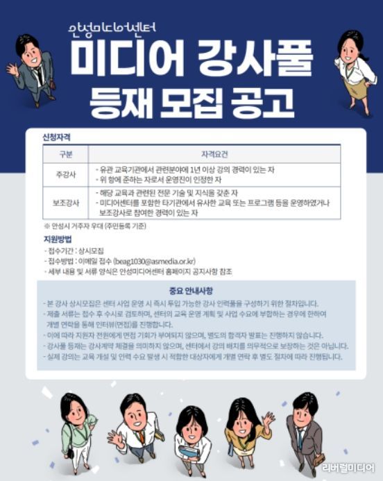 [리버럴미디어=공소리 기자] 안성시는 4월 1일부터 보다 체계적이고 전문적인 미디어 교육 운영을 위해 ‘미디어 강사풀’ 등재 강사를 상시 모집한다.