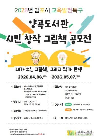 [리버럴미디어=공소리 기자] 김포시 양곡도서관은 2026년 김포시 교육발전특구 사업의 일환으로 시민 작가를 발굴하고 유아 독서교육의 기반을 마련하기 위해 ‘시민 창작 그림책 공모전’을 개최한다.