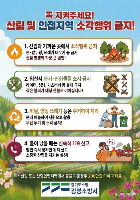 이에 따라 광명소방서는 봄철 기간 동안 산림 인접지역과 주거 밀집지역, 화재취약시설을 중심으로 예방순찰과 안전지도를 강화하고, 시민 대상 화재예방 홍보를 집중 추진할 방침이다. 특히 산림 및 인접지역 소각행위 금지, 담배꽁초 무단 투기 금지, 쓰레기 소각 금지 등 부주의 화재예방 수칙을 적극 안내할 예정이다.