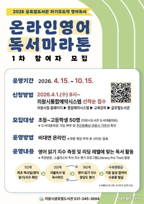 [리버럴미디어=공소리 기자] 의왕시 글로벌도서관은 학생들의 영어 독서 흥미를 높이고 자기주도적 학습 습관 형성을 지원하기 위해 기획된 '온라인 영어독서마라톤'의 1차 참여자 50명을 모집하고 있다.