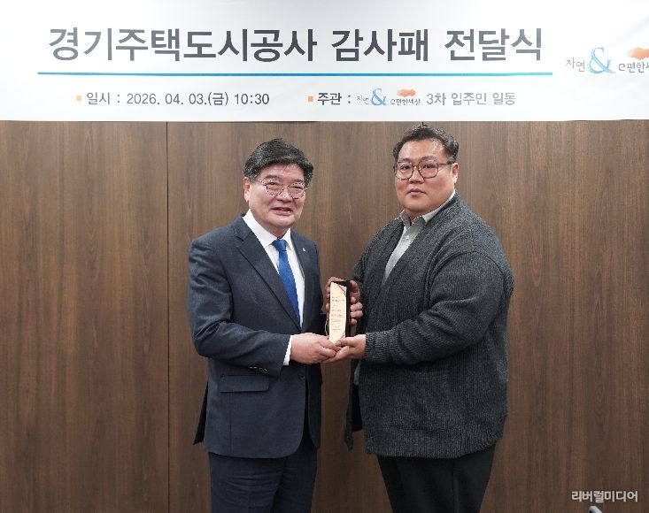 [리버럴미디어=공소리 기자] 경기주택도시공사(GH)가 수원 본사에서 다산자연앤이편한세상3차 아파트 입주민들로부터 원활한 조기 분양전환 노력과 제도적 지원에 따른 공로를 인정받아 감사패를 받았다고 3일 밝혔다.