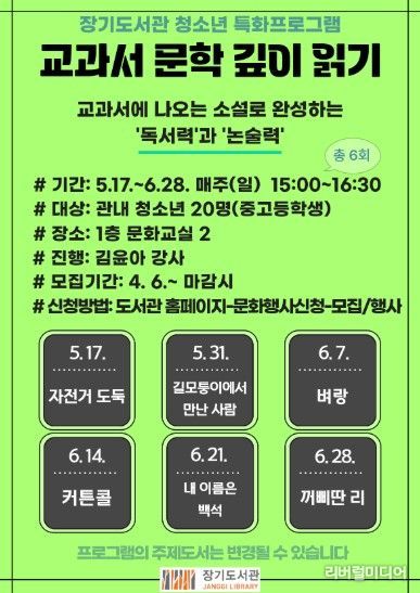 [리버럴미디어=공소리 기자] 김포시 장기도서관은 청소년의 독서력과 논술력 향상을 위해 '교과서 문학 깊이 읽기' 프로그램을 오는 5월 17일부터 6월 28일까지 진행한다.