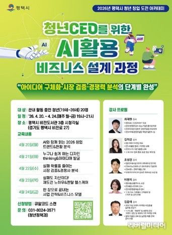 [리버럴미디어=공소리 기자] 평택시는 오는 20일부터 24일까지(주5일, 19~21시) 평택시 비전도서관 시청각실에서 ‘청년 창업 도전 아카데미’ 강좌를 개설하고, 참여자 20명을 모집한다고 밝혔다.