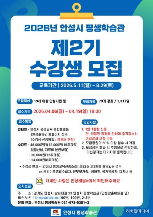 [리버럴미디어=공소리 기자] 안성시는 시민의 배움 기회를 확대하고 평생학습 참여를 활성화하기 위해 '2026년 평생학습관 제2기 프로그램' 수강생을 모집한다.