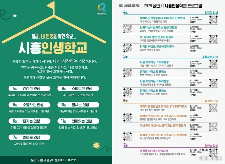 김상동 평생교육원장은 “시흥인생학교는 중장년의 삶 전반을 체계적으로 지원하는 통합형 인생 설계 플랫폼”이라며 “건강 회복에서 시작해 관계 확장, 새로운 도전과 성찰로 이어지는 여정을 통해 중장년 시민들이 스스로 삶의 방향을 설계할 수 있도록 적극 지원하겠다”라고 밝혔다.