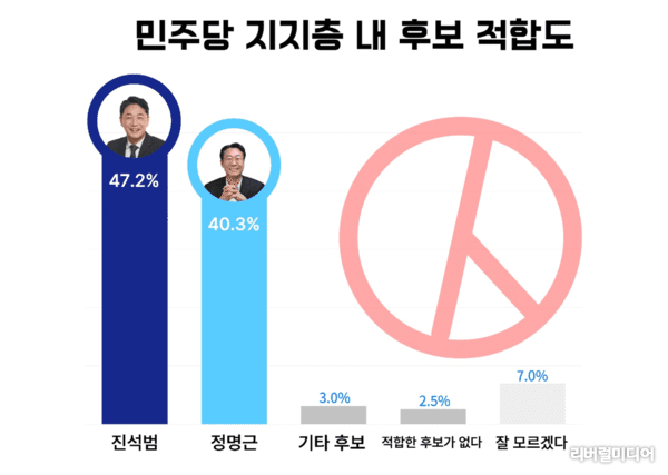 지켜볼만한 대목은 민주당 지지층에서 진석범 후보의 강세가 더욱 두드러졌다는 점이다. 진 후보는 민주당 지지층 내 47.2%의 후보 적합도를 기록해 정명근 시장(40.3%)을 6.9%p 앞서며 민주당 지지층에서 우위를 보였다. 당내 경선에서 지지층 여론이 중요한 만큼, 향후 판세를 가를 핵심 변수로 평가된다.