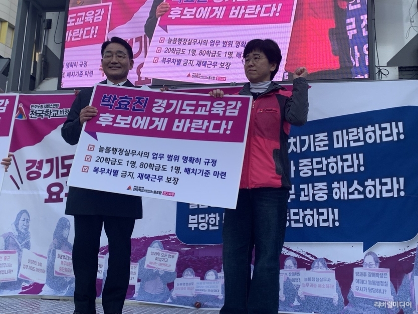 [리버럴미디어=공소리 기자] 지난 7일 경기도교육청 앞에서 ‘늘봄행정실무사 처우 개선’을 촉구하는 집회가 열렸다. 이날 집회에는 박효진 경기도교육감 예비후보가 참석해 현장의 요구에 공감을 표하며 제도 개선의 필요성을 강조했다.