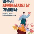 [리버럴미디어=공소리 기자] 양주시자원봉사센터는 오는 12월 6일, ‘2025 양주시 자원봉사자의 날 기념행사’를 개최한다고 밝혔다. 올해 기념행사는“모든날 모든순간, 자원봉사자를 기억합니다.”라는 슬로건 아래, 한 해 동안 나눔을 실천하며 헌신해 온 자원봉사자들의 노고에 깊은 감사를 전하고, 서로를 격려하는 축제의 장으로 자원 봉사의 가치를 더욱 확산하기 위해 마련됐다. 행사는 경기섬유종합지원센터에서 진행되며 1부 식전 공연, 활동 성과보고, 동영상 상영, 기념식(축사, 기념사, 표창전수)으로 봉사자들의 헌신을 기리는 의미있는 시간에 이어, 2부 자원봉사자 한마음 장기자랑으로 지난 예선을 통과한 TOP8팀의 끼와 재능을 나누며 현장의 분위기를 뜨겁게 달구고, 3부 초청가수의 축하공연으로 함께 즐기는 화합의 시간이 될 것으로 기대된다. 또한 자봉이와 함께하는 포토존 및 봉사자들을 위한 캘리그라피, 인생네컷, 드립커피시연, 행운의 뽑기 등 부대행사가 준비되어 있어 지역사회 내 봉사자들의 유대감을 더욱 강화하는 계기가 될 예정이다. 양주시자원봉사센터 관계자는 “이번 행사가 한 해 동안 묵묵히